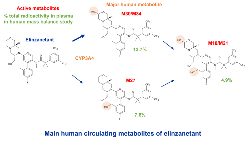 Elinzanetant is extensively oxidised to several metabolites in vivo. Three of these are circulating active metabolites which have similar pharmacological activity to the parent drug, and may contribute to the overall efficacy.