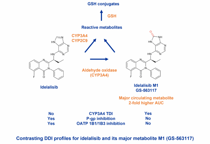 One interesting example cited is the drug idelalisib which has a black box warning due to hepatotoxicity, likely due to reactive metabolites formed in the liver from both the parent drug and its major circulating metabolite M1 (GS-563117) [2]. M1 is formed predominantly by aldehyde oxidase and circulates at 2-fold higher than the parent drug in humans. It is a TDI of CYP3A4, in contrast to the parent which does not inactivate CYP3A4 but does inhibit P-gp (P-glycoprotein) and OATP (organic anion transporting polypeptide) 1B1 and 1B3.